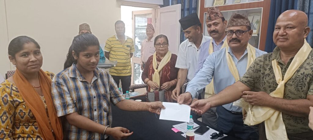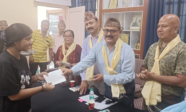 शाखा अध्यक्ष श्री मीन बहादुर खत्रीजी ने शाखाकी ओरसे केंद्रीय अध्यक्ष श्री पदम सिंह थापाजी को छात्रवृत्ति सहयोग राशि- पचास हजार रूपये (50,000/- रूपये)का चैक प्रदान किया